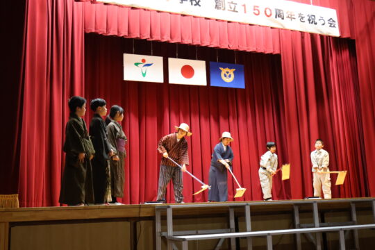 3年生以上による「栗栖池物語」では、水不足に悩み、池をつくって、村を水不足から救った先人の思いや苦労を劇で表現しました。西栗栖の村の方がどんな思いで話し合い決断し、長