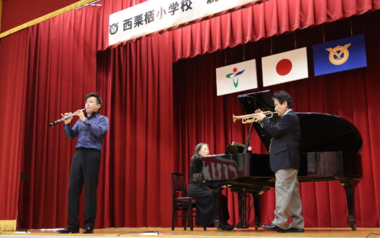 たつの市音楽協会からオーボエの井口英樹さん、トランペットは西栗栖小学校出身の小林仁史さん、ピアノの八木昭子さんにお越しい